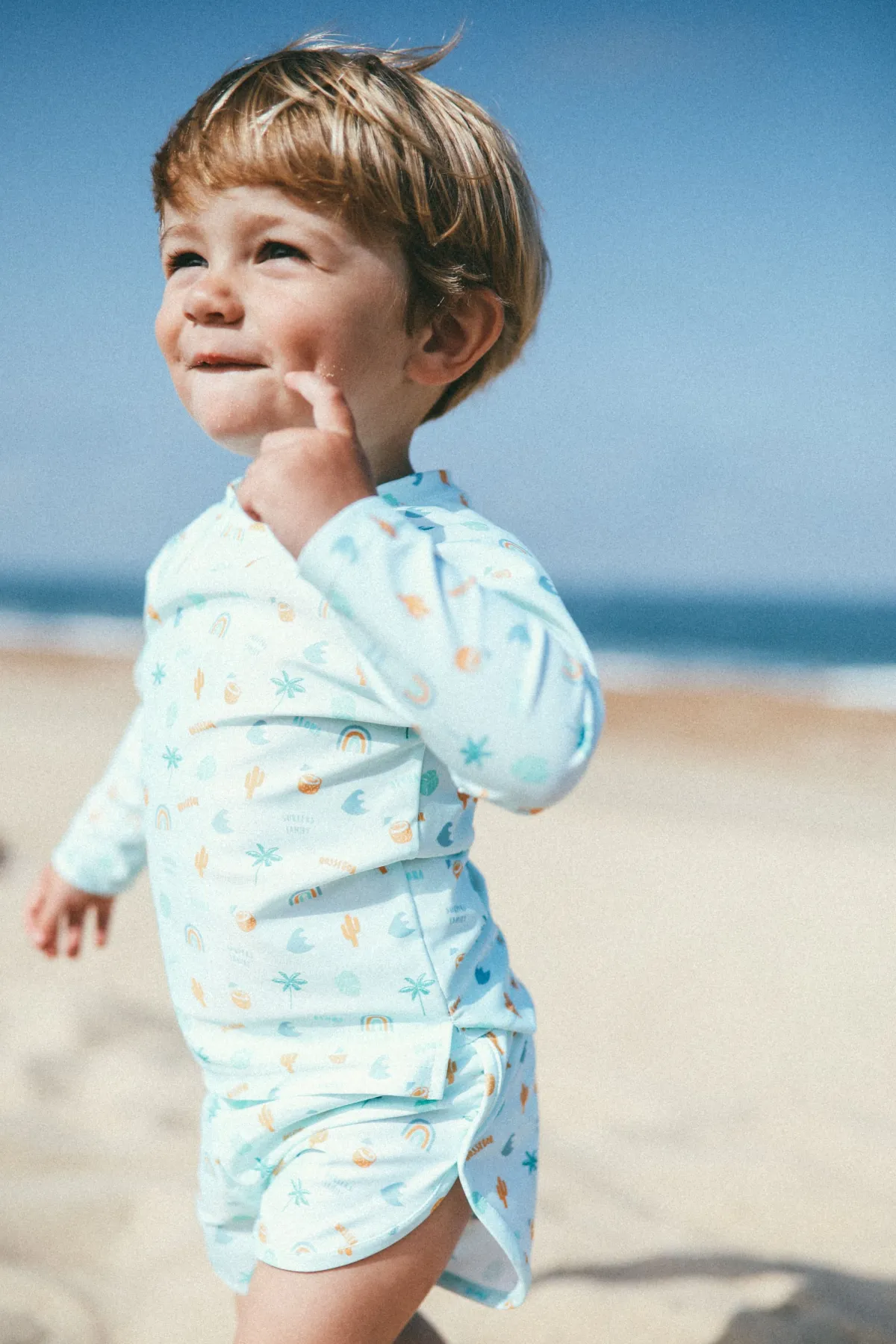 Pretty little long-sleeved swimsuit for little girls with a daisy pattern. Easy to put on thanks to the white zip on the front. Econyl® material Fully UV resistant UPF50+ and made from plastic waste.