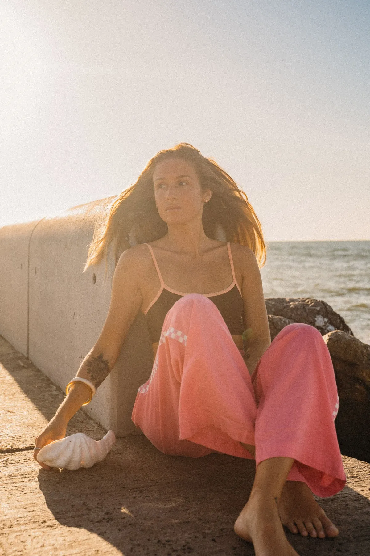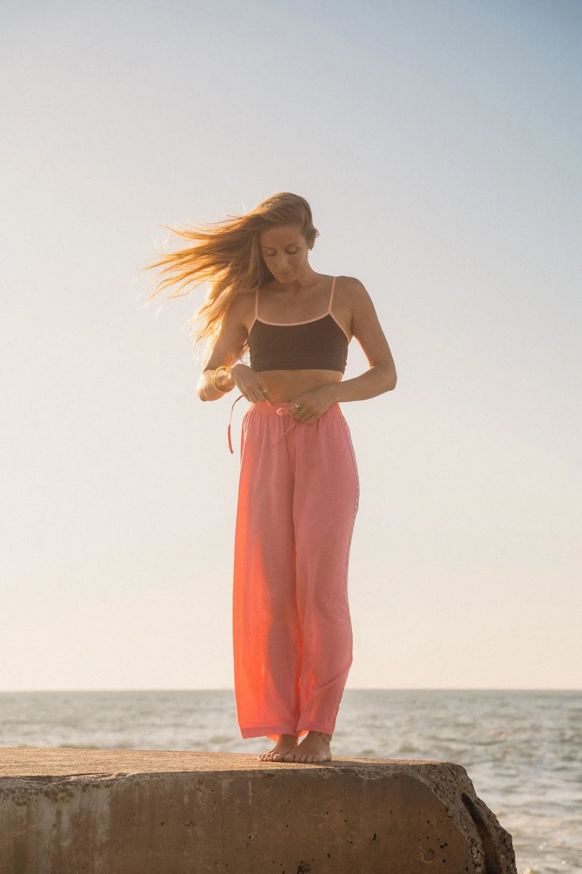 Pink linen pants. The kind you slip on and never want to take off! Comfortable thanks to their elastic waistband, light as a summer breeze thanks to their breathable linen, these pink pants combine simplicity and effortless style.