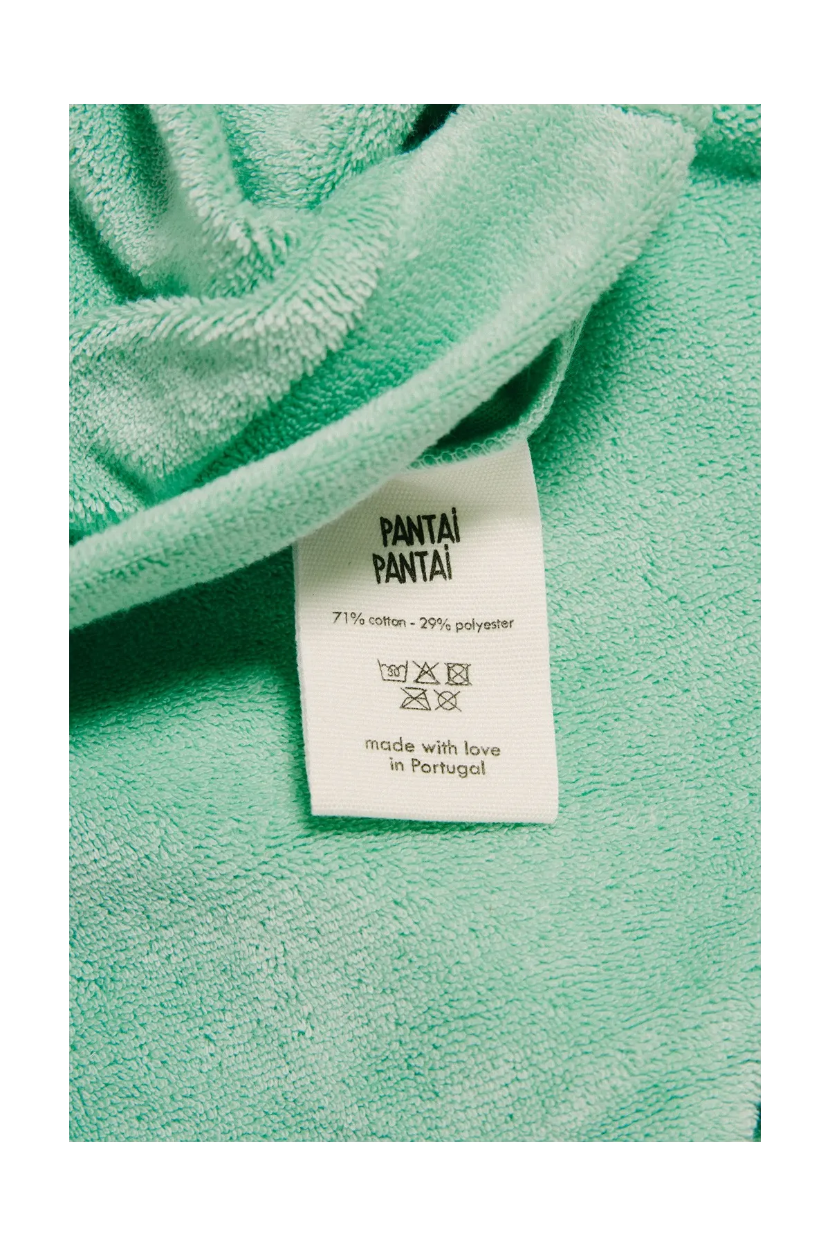hooded Terry poncho for your kids. A must have after any bathing in a pool or in the ocean! 2 colors available: citrus yellow or mint 2 sizes: 1-3 years old or 3-6 years old
