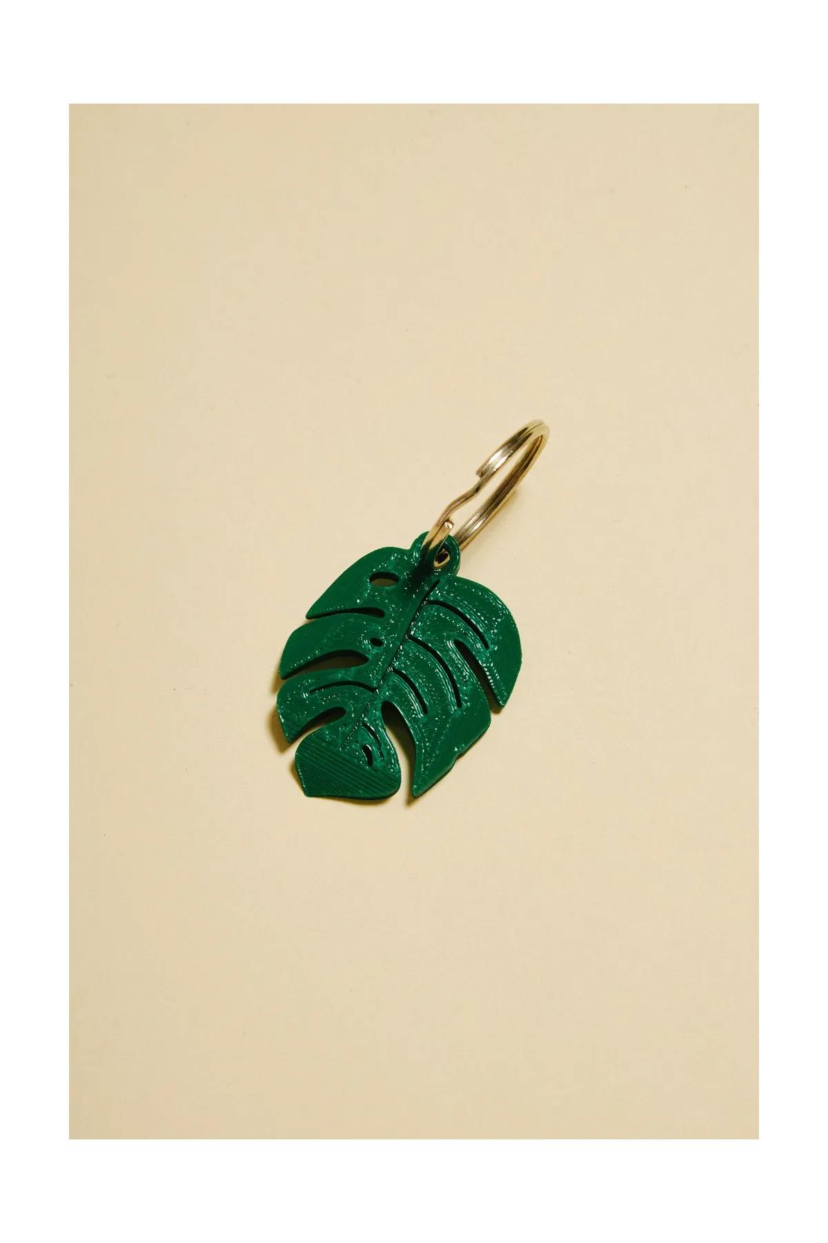 Key chain representing a tropical monstera leaf.