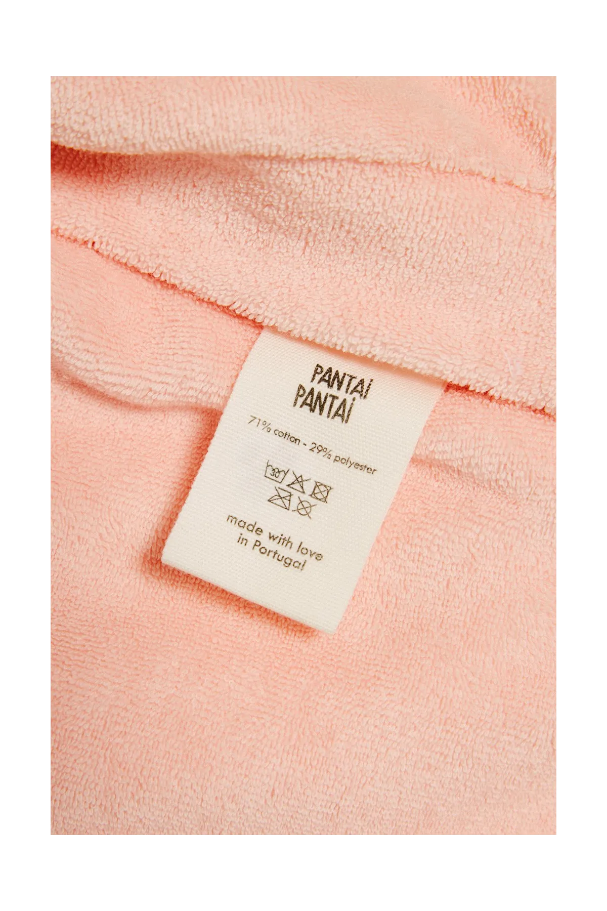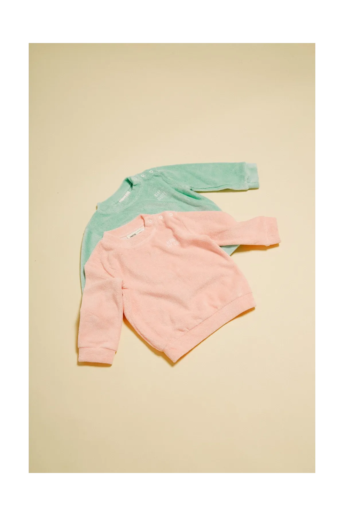 Petit sweat en éponge rose avec 3 pressions sur l'épaule pour l'enfiler en douceur.