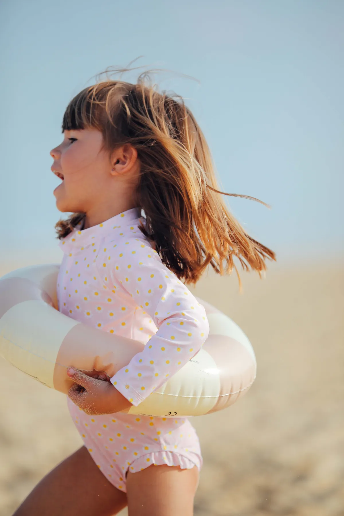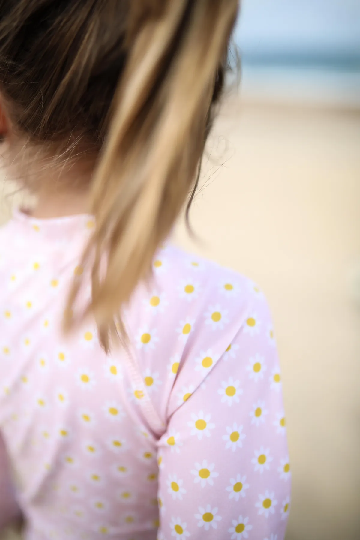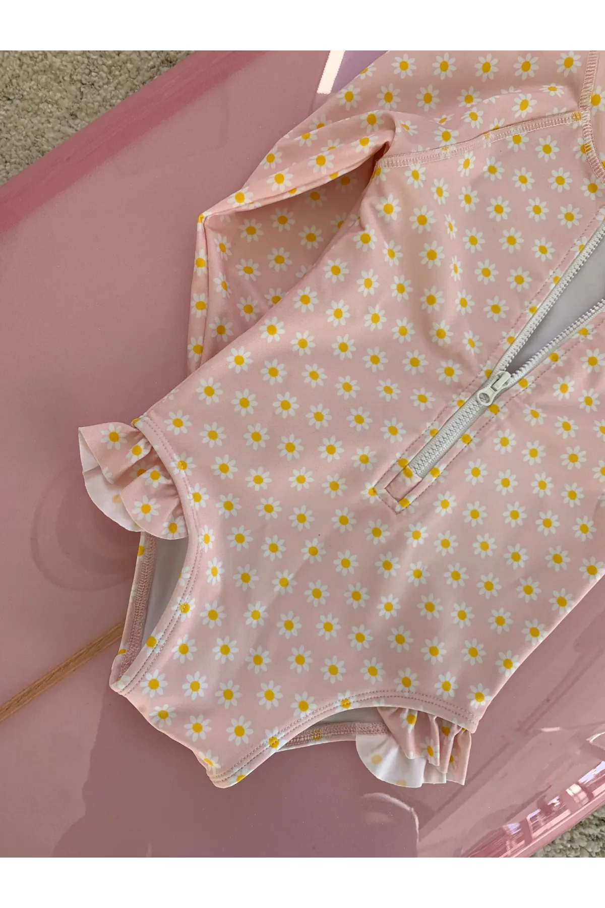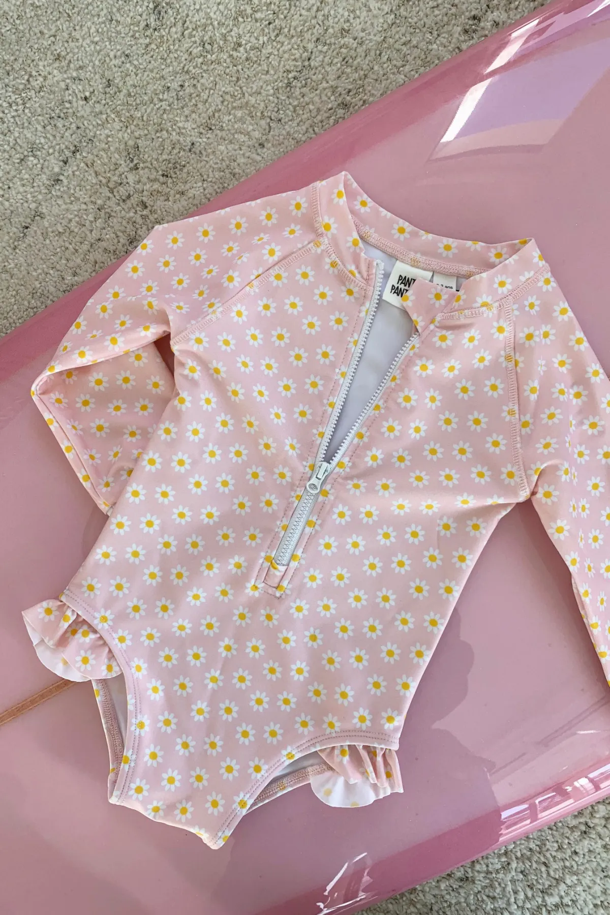 Maillot de bain 1 pièce à manches longues pour petites filles avec imprimé marguerites sur fond rose clair.