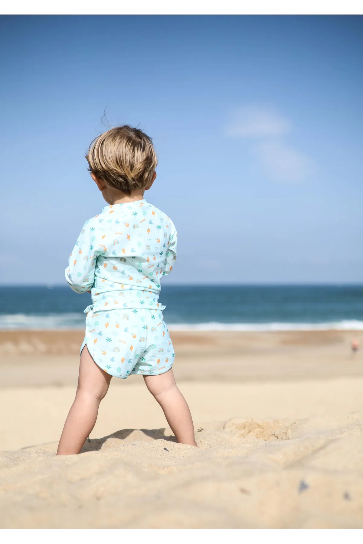 Le mini short lycra Aloha est idéal pour les petits surfeurs avec ses différents motifs (aloha, palmier, arc en ciel…). Sa jolie couleur vert d’eau et son cordon à la taille font du short lycra imprimé un indispensable de l’été. Il peut être porté avec ou sans couche du fait de l’absence de filet à l’intérieur.