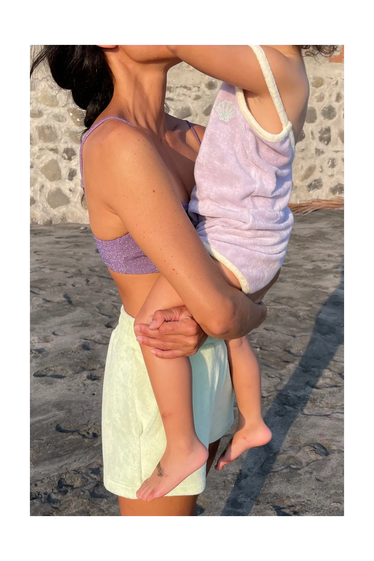 Adorable petite combishort pour les filles en tissu éponge lilas. Vous allez adorer ses détails avec son petit dos nus, ses bretelles écrus et sa broderie coquillage vert clair sur la poitrine.