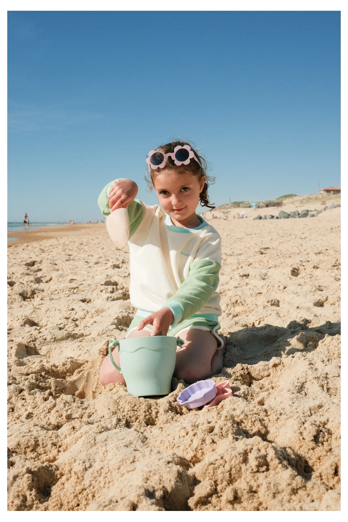 Adorable petite combishort pour les filles en tissu éponge lilas. Vous allez adorer ses détails avec son petit dos nus, ses bretelles écrus et sa broderie coquillage vert clair sur la poitrine.