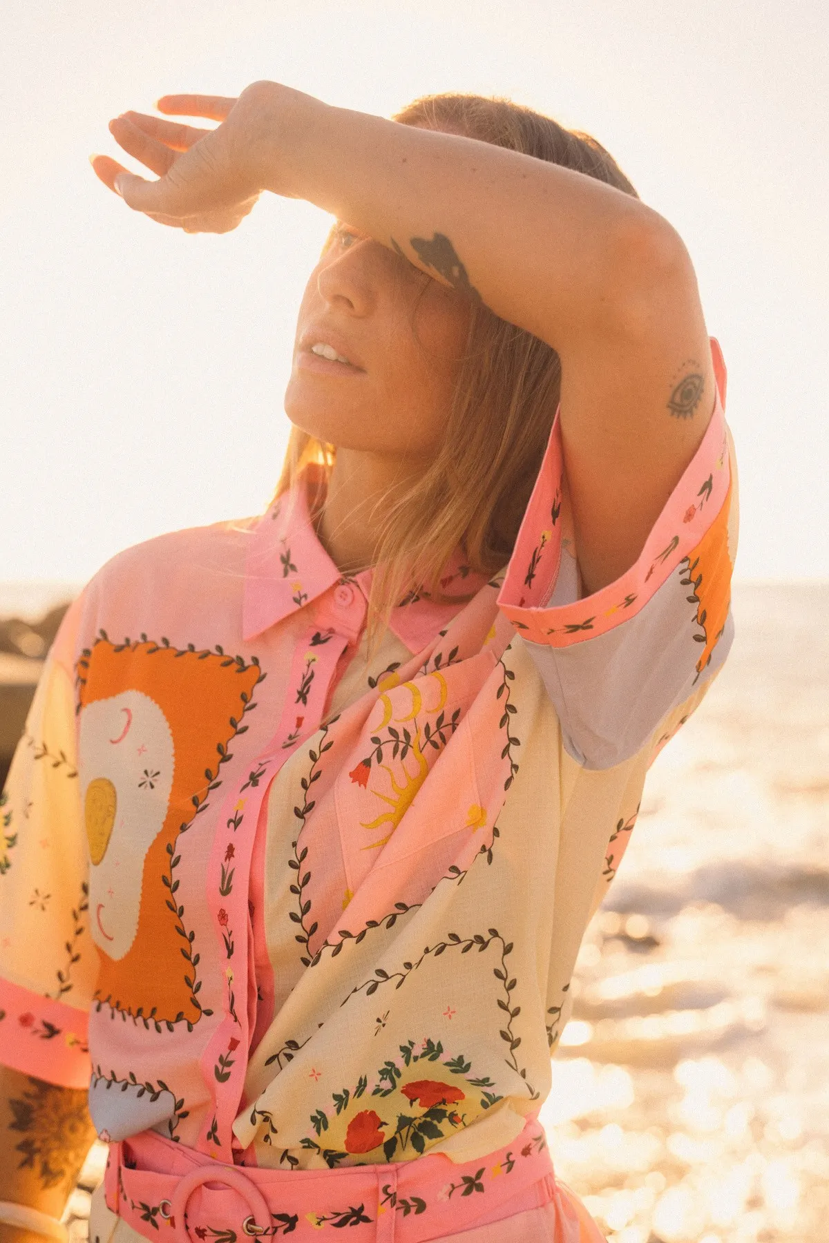 Cet imprimé mêle des roses en fleur, un soleil délicat et une lune paisible dans une palette de roses poudrés, pastels nacrés et lueurs dorés. Chaque détail évoque un moment suspendu entre ciel et terre.